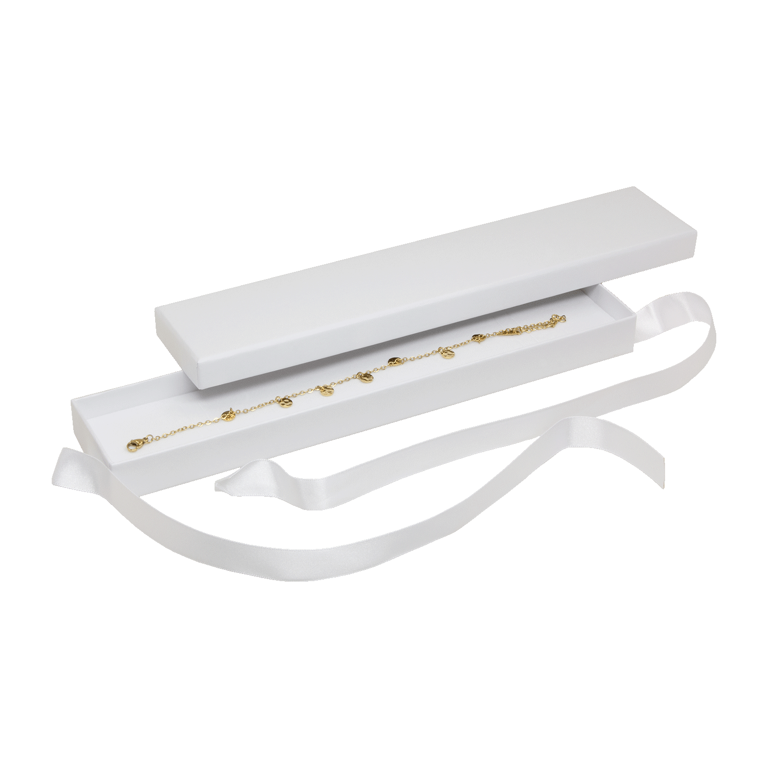 De Sieradendoos van de Serie 0276 LOOP in elegant wit biedt de ideale verpakkingsoplossing voor armbanden en horloges. Met afmetingen van 255 x 50 x 20 mm biedt ze voldoende ruimte voor uw hoogwaardige producten. De voering bestaat uit een gelamineerde schuimstof inleg in wit, die uw sieraden veilig en stijlvol presenteert. Wilt u uw doos personaliseren? Geen probleem! Met de mogelijkheid voor reliëfdruk met folie, zowel aan de buitenkant als binnenkant, in goud, zilver, zwart of vrijwel elke gewenste kleur, kunt u uw verpakking individueel vormgeven. Ook meerkleurige reliëfdruk is tegen meerprijs mogelijk. De Sieradendoos van de Serie 0276 LOOP verenigt functionaliteit met stijlvol ontwerp en biedt uw sieraden en horloges een elegante omlijsting. Ontdek nu de veelzijdige mogelijkheden om uw producten perfect in scène te zetten.