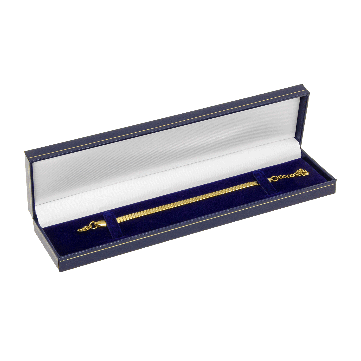 De sieradenetuis van de serie 5516 MANHATTAN in de buitenkleur blauw bieden de perfecte verpakkingsoplossing voor armbanden met stijl. De afmetingen van 213 x 44 x 17 mm zorgen voor een optimale pasvorm en presentatie. Binnenin overtuigt de juwelen gerelateerde inleg in wit en blauw, die uw sieraden elegant omlijst. Bijzonder opmerkelijk is de mogelijkheid tot personalisatie door middel van foliedruk. Kies uit goud, zilver, zwart of vrijwel elke gewenste kleur om uw sieradenetuis uniek te maken. Tegen meerprijs zijn zelfs meerkleurige afdrukken mogelijk. Voor juweliers, goudsmeden en sieradenmerken zijn deze sieradenetuis van hoge kwaliteit een must-have om uw armbanden stijlvol en professioneel te presenteren. Gun uw sieraden de verpakking die ze verdienen en verras uw klanten met de sieradenetuis van de serie 5516 MANHATTAN.